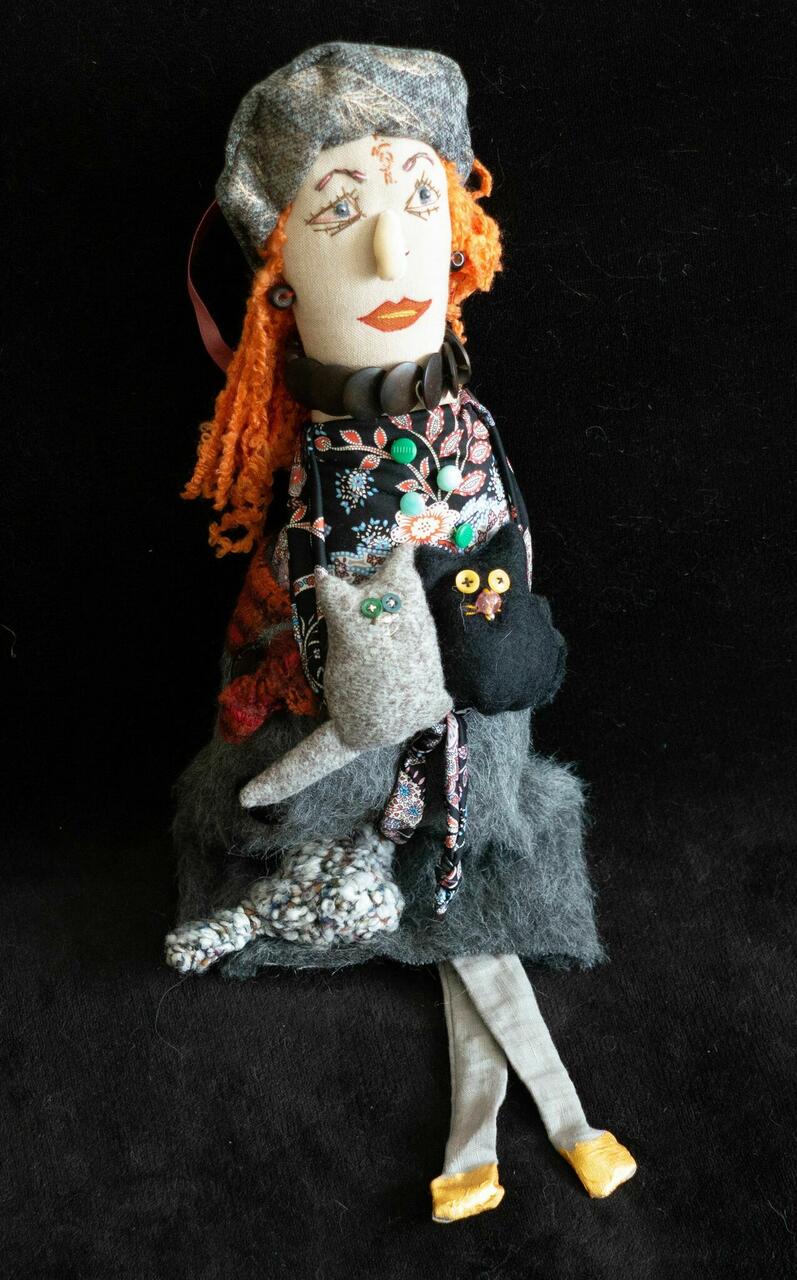 Käsitööna loodud, eriilmeline suur nukk kolme kassiga