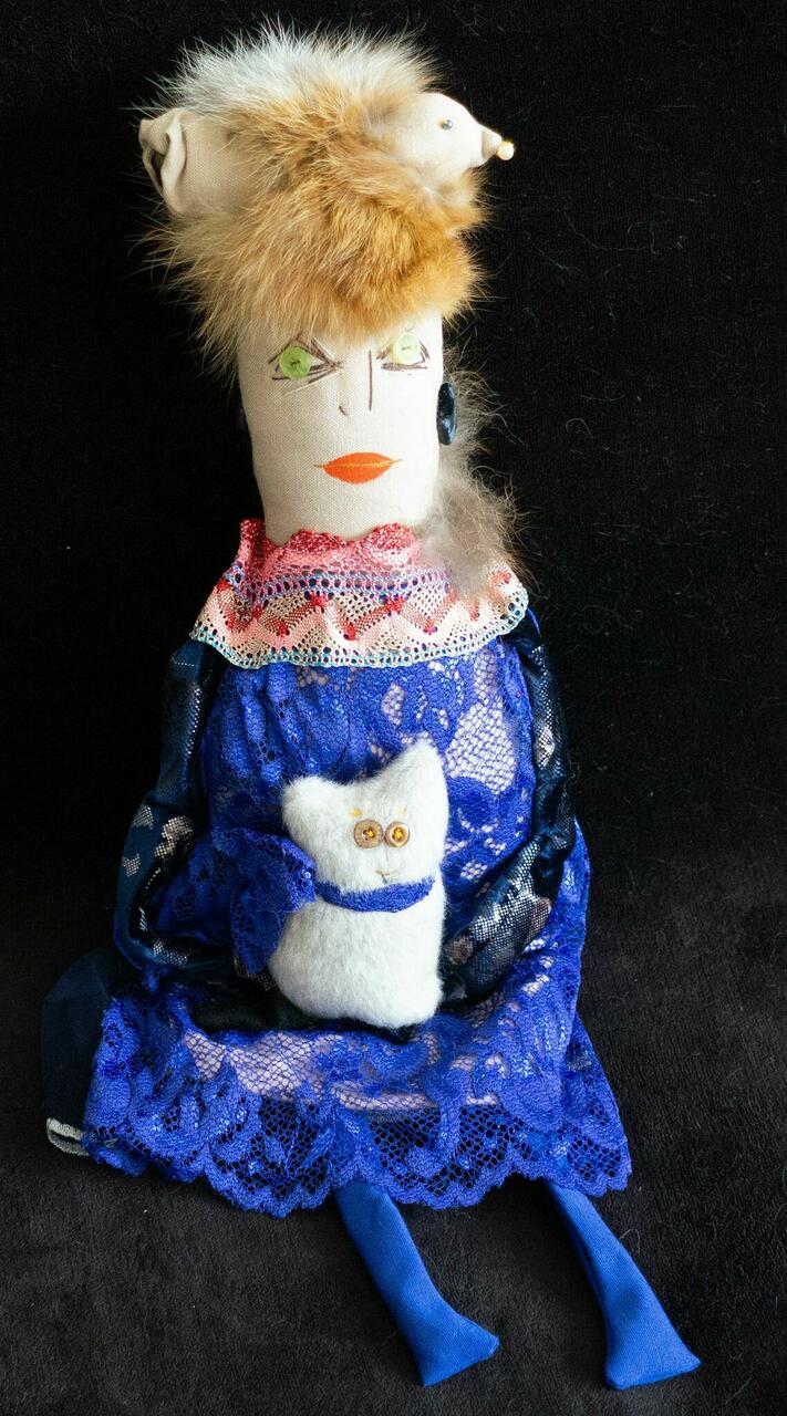 Käsitööna loodud, eriilmeline suur nukk kassiga