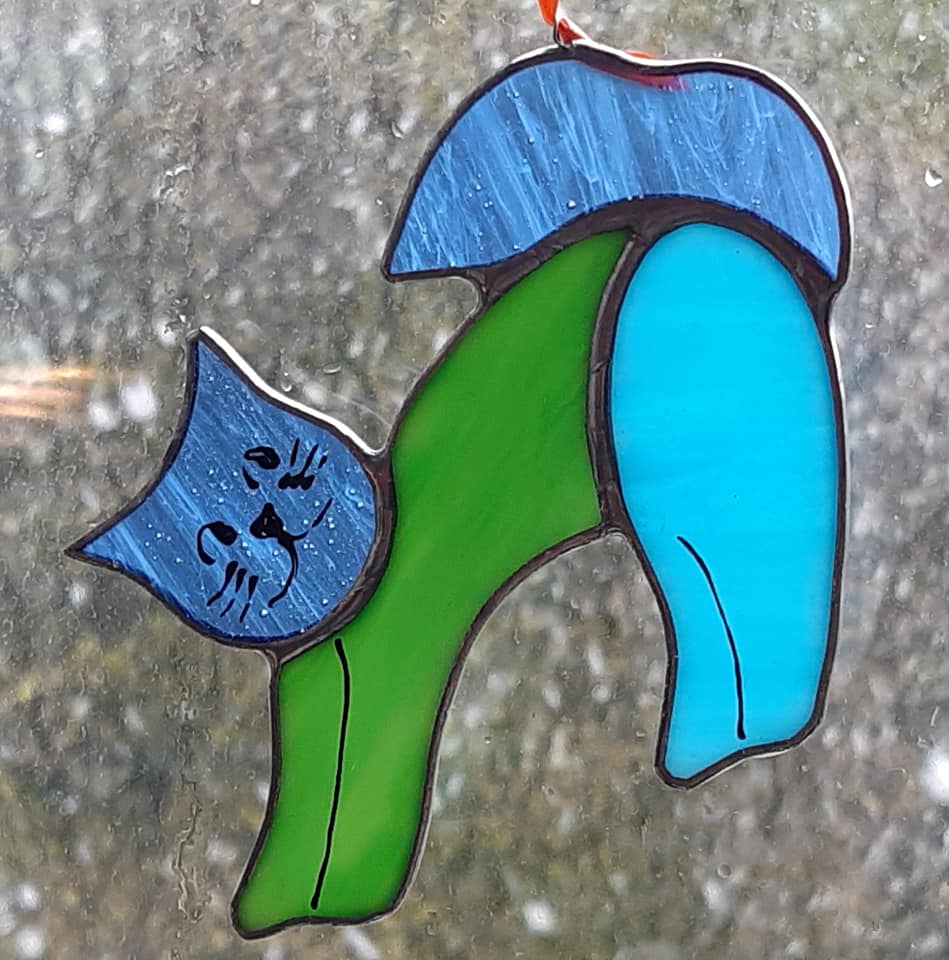 Erksavärviline (roheline, helesinine, sinine) erineva tekstuuriga klaasist vitraaž